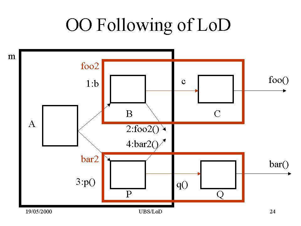 The Law of Demeter for functions states that any method of an object should call only methods belonging to itself, any parameters that were passed in to the method, any objects it created, or any directly held component object.
